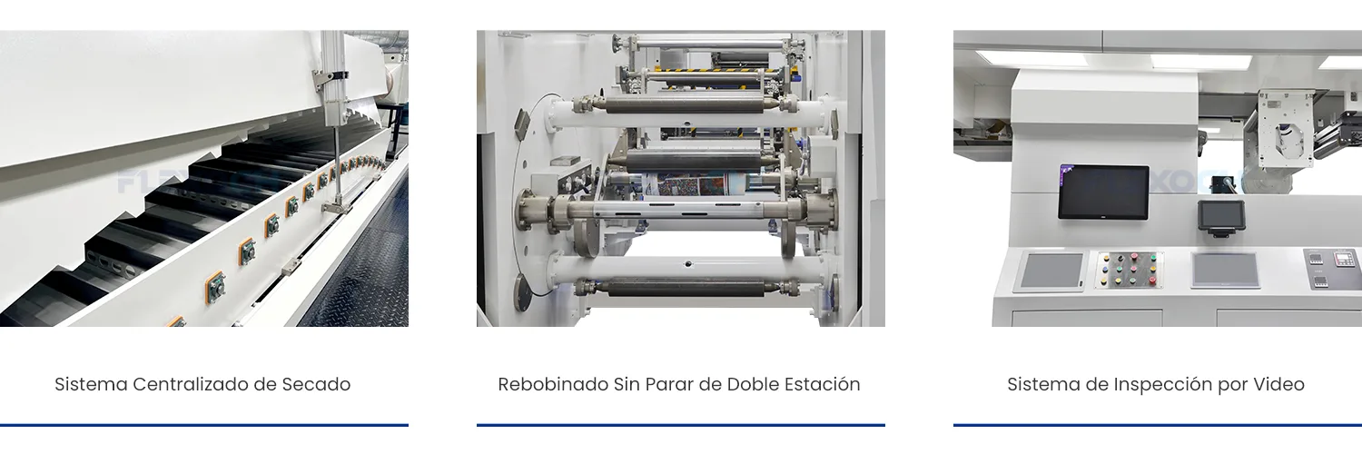 Otro de los aspectos más valorados en este tipo de equipos es el nivel de automatización. Este impresor de flexografia integra sistemas avanzados que optimizan el proceso productivo, como el registro automático de color y el control preciso de tensión.