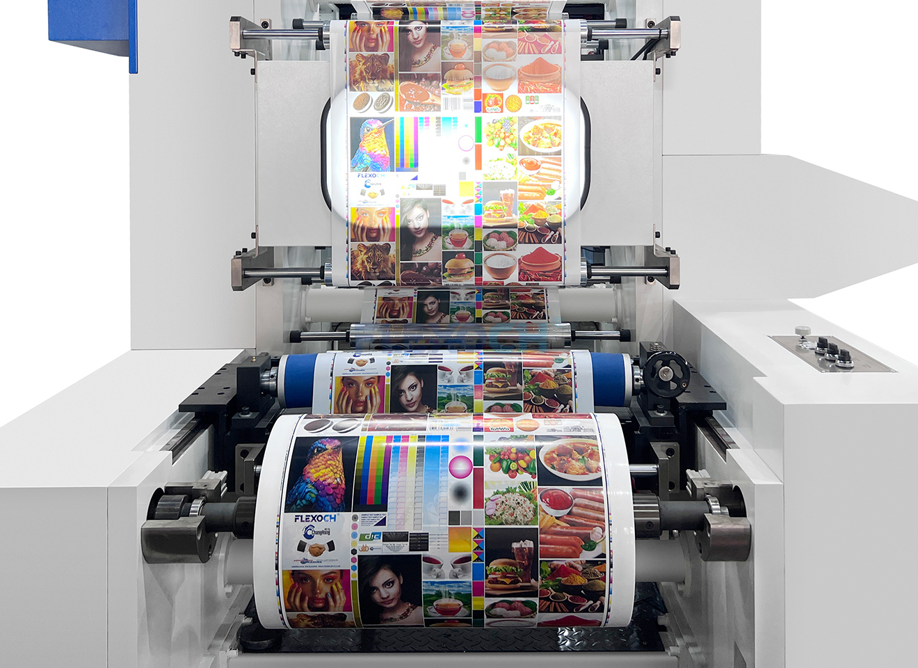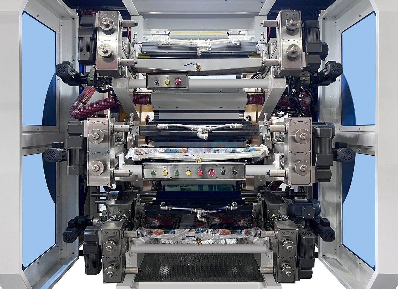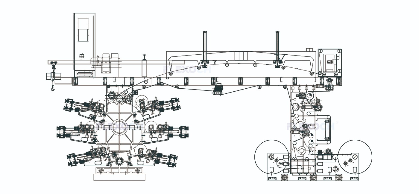 Diseño del cilindro central de impresión (cilindro CI): Todos los grupos de impresión están dispuestos alrededor de un cilindro de gran diámetro. La película plástica se adhiere estrechamente al cilindro durante su recorrido, lo que reduce las variaciones de tensión, garantiza una precisión de registro de ±0,1 mm y evita la deformación por estiramiento de la película.
